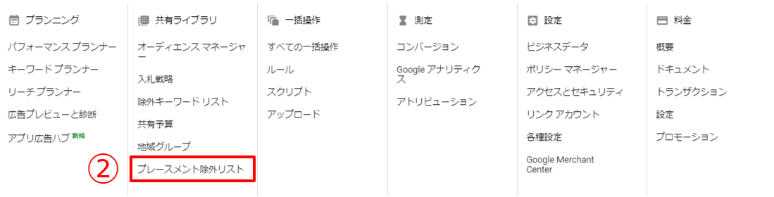 ②「共有ライブラリ」の下にある 「プレースメント除外リスト」をクリック