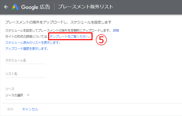 ⑤すでに作成いただいたプレースメント除外リストがない場合は、「テンプレートを表示」をクリックし、テンプレートをダウンロード