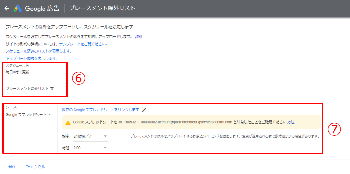 ⑥「スケジュール名」「プレースメント除外リスト名」を記入。