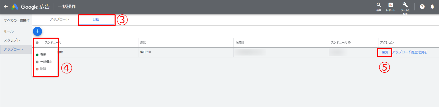 ④スケジュール設定された項目の左側にある色付きのアイコンで、「有効」、「一時停止」、「削除」 のいずれかを選択