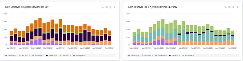 以下はAdjustの公式ヘルプから参照した、ネットワーク別の日別インストール数推移グラフです。