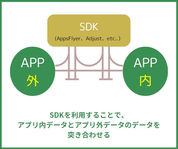 この第三者計測ツールの提供するSDKを利用することによって、アプリ内外のデータを突き合わせられ、セッションが途切れることなく流入経路別の分析が可能になるのです。