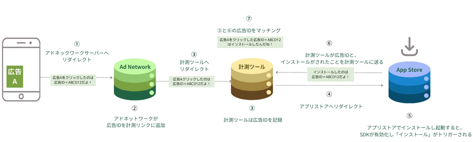 - アドネットワークがユーザーを計測ツールへリダイレクトする。計測ツールは②で追加された広告IDを記録する。