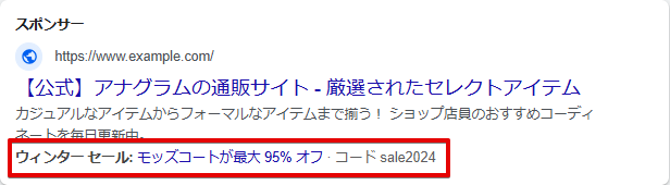プロモーション表示オプションとは、検索広告にセールやキャンペーンの情報を広告や説明文の下に追加で表示できる機能です。