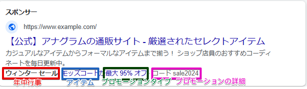 プロモーション表示オプションを使うことで、セールやお得なキャンペーン情報を目立たせて表示できます。短期間のセールやキャンペーンでも、広告文を毎回変更したり広告のパフォーマンスデータがリセットされる心配もないので、気軽に取り入れやすいのが魅力です。