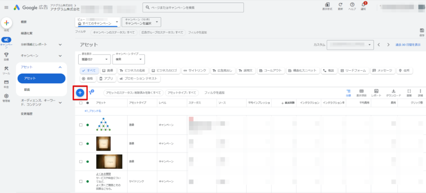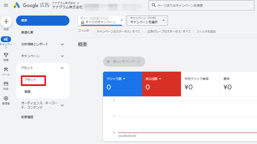 Google広告の管理画面左メニューの「アセット」から「アセット」を選択します。