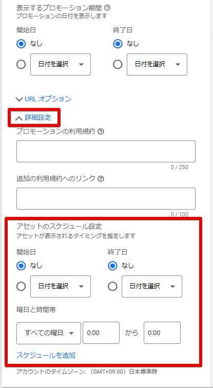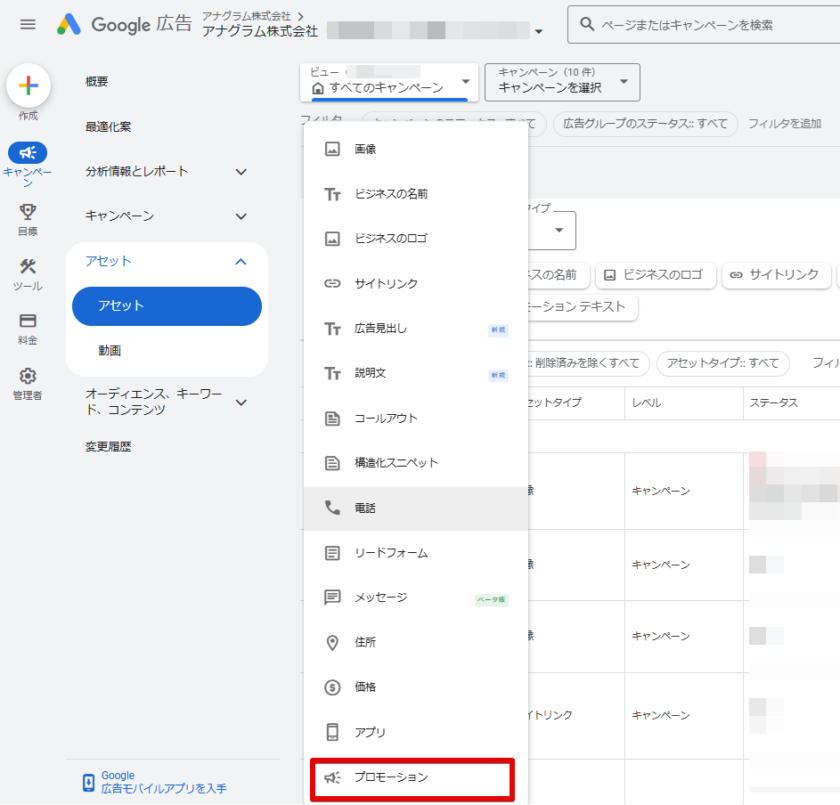 Google広告のプロモーション表示オプションの設定は、他の広告表示オプションの設定と同じく「アセット」の作成画面から行います。