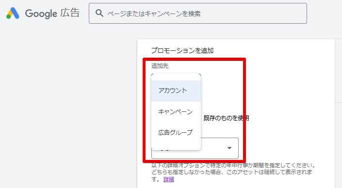 ①[追加先] からプルダウンでプロモーション表示オプションを適用したい単位をアカウント、キャンペーン、広告グループから選択します。