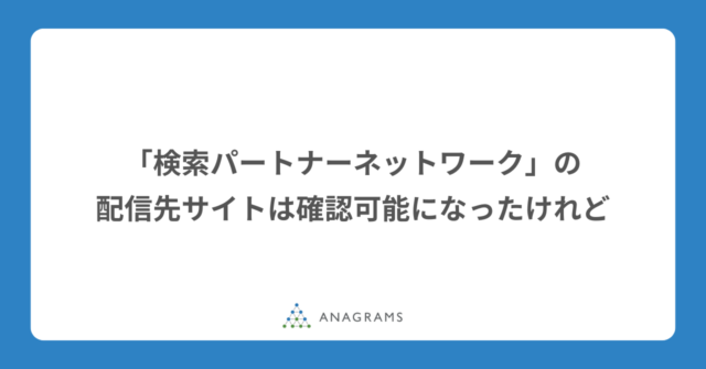 <blockquote class="wp-embedded-content" data-secret="NMIaVWpEIX"><a href="https://anagrams.jp/blog/search-partner-network-sites-viewable-but/">Google広告「検索パートナーネットワーク」の配信先サイトは確認可能になったけれど</a></blockquote><iframe sandbox="allow-scripts" security="restricted" src="https://anagrams.jp/blog/search-partner-network-sites-viewable-but/embed/#?secret=NMIaVWpEIX" width="600" height="400" title="“Google広告「検索パートナーネットワーク」の配信先サイトは確認可能になったけれど” — アナグラム株式会社" data-secret="NMIaVWpEIX" frameborder="0" marginwidth="0" marginheight="0" scrolling="no" class="wp-embedded-content"></iframe><script type="text/javascript"> /* <![CDATA[ */ /*! This file is auto-generated */ !function(d,l){"use strict";l.querySelector&&d.addEventListener&&"undefined"!=typeof URL&&(d.wp=d.wp||{},d.wp.receiveEmbedMessage||(d.wp.receiveEmbedMessage=function(e){var t=e.data;if((t||t.secret||t.message||t.value)&&!/[^a-zA-Z0-9]/.test(t.secret)){for(var s,r,n,a=l.querySelectorAll('iframe[data-secret="'+t.secret+'"]'),o=l.querySelectorAll('blockquote[data-secret="'+t.secret+'"]'),c=new RegExp("^https?:$","i"),i=0;i<o.length;i++)o[i].style.display="none";for(i=0;i<a.length;i++)s=a[i],e.source===s.contentWindow&&(s.removeAttribute("style"),"height"===t.message?(1e3<(r=parseInt(t.value,10))?r=1e3:~~r<200&&(r=200),s.height=r):"link"===t.message&&(r=new URL(s.getAttribute("src")),n=new URL(t.value),c.test(n.protocol))&&n.host===r.host&&l.activeElement===s&&(d.top.location.href=t.value))}},d.addEventListener("message",d.wp.receiveEmbedMessage,!1),l.addEventListener("DOMContentLoaded",function(){for(var e,t,s=l.querySelectorAll("iframe.wp-embedded-content"),r=0;r<s.length;r++)(t=(e=s[r]).getAttribute("data-secret"))||(t=Math.random().toString(36).substring(2,12),e.src+="#?secret="+t,e.setAttribute("data-secret",t)),e.contentWindow.postMessage({message:"ready",secret:t},"*")},!1)))}(window,document); /* ]]> */ </script>