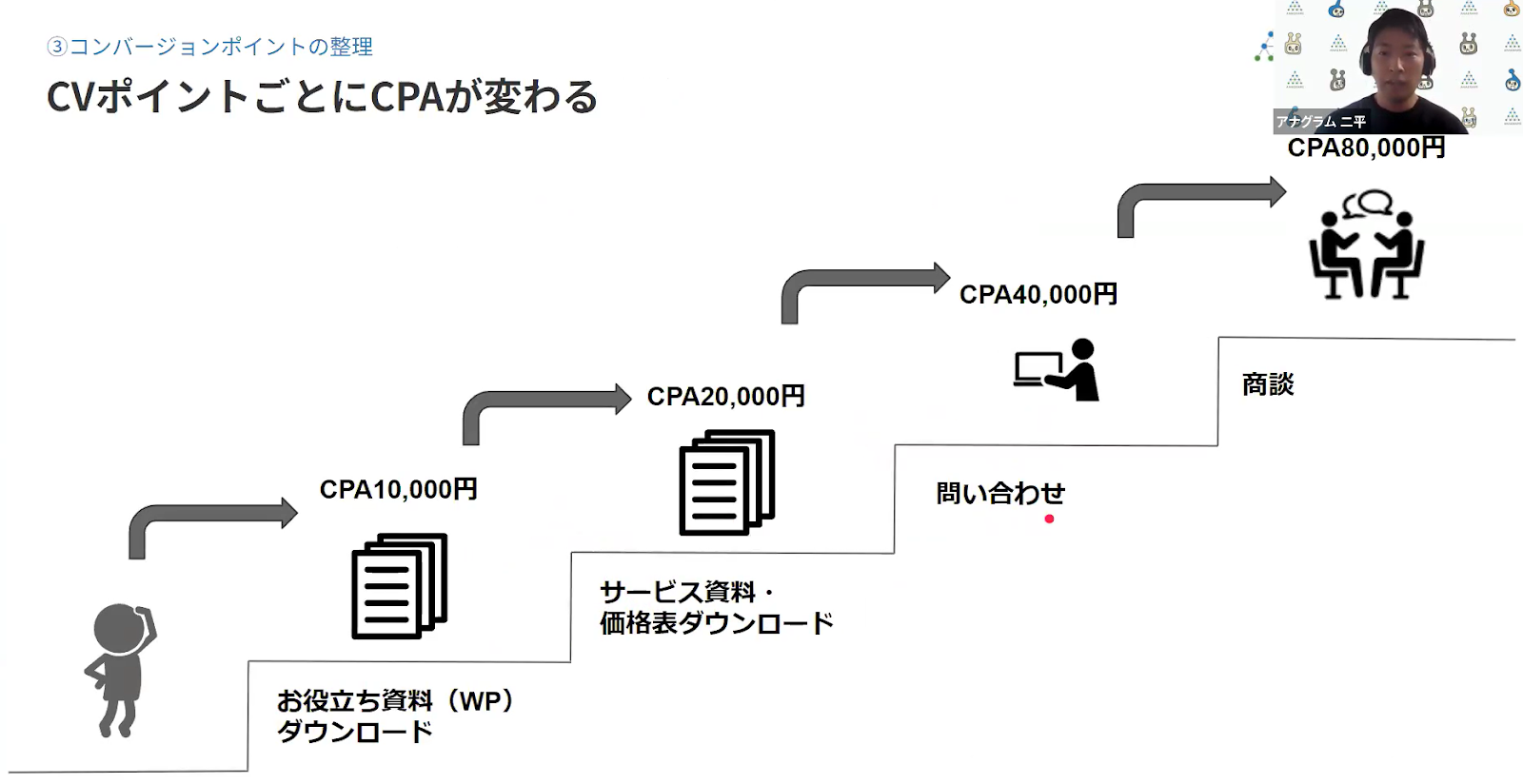 「BtoBでは、検討期間が長く、事前の情報収集が不可欠になっている。だからこそ、コンバージョンポイント(CVポイント)は問い合わせ以外にも、ホワイトペーパー請求などのハードルが低いものを複数設ける必要がある」(二平)