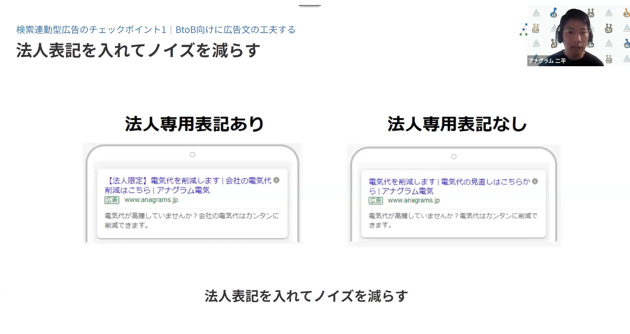 法人向けサービスを提供する際には、その旨を明確に表記することが大切です。例えば、電気代の節約は個人にとっても法人にとっても重要な課題です。こうした場合、広告文に法人向けであることをはっきりと記載することで、できる限りノイズを減らしています。