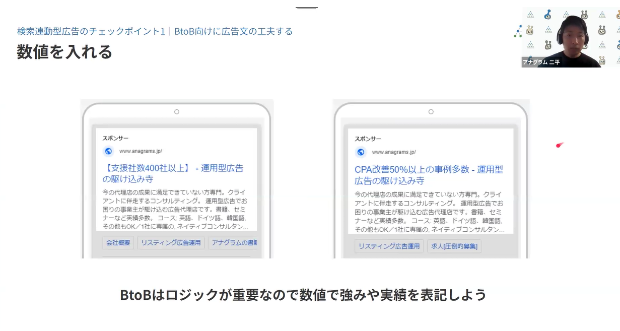 先日アナグラムが行ったウェビナーでは、「BtoB向けの広告運用の基礎戦略と実践」と題し、BtoBビジネスにおいて広告運用で成果を上げるために今すぐ確認したいチェックポイントを以下の4つの項目に分けてそれぞれご紹介しました。