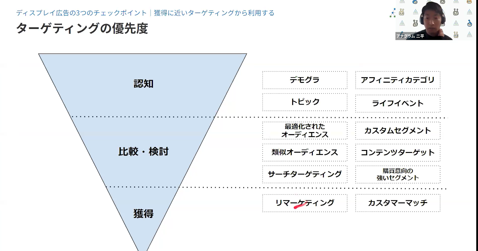 ここではディスプレイ広告に取り組む際のターゲティングが「認知」「比較・検討」「獲得」の3階層にわけて紹介されました。これだけ多くのターゲティングが可能となると、どれから手をつけて良いかなかなかな分かりづらいという方も多いのではないでしょうか。