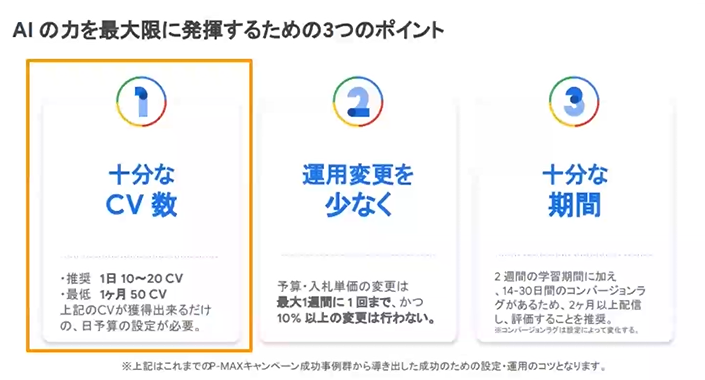 1つ目は、安定的なコンバージョン数の確保。2つ目は、広告運用の変更を最小限に抑え、できるだけAIに任せること。そして3つ目が、少なくとも十分な学習期間を確保することです。