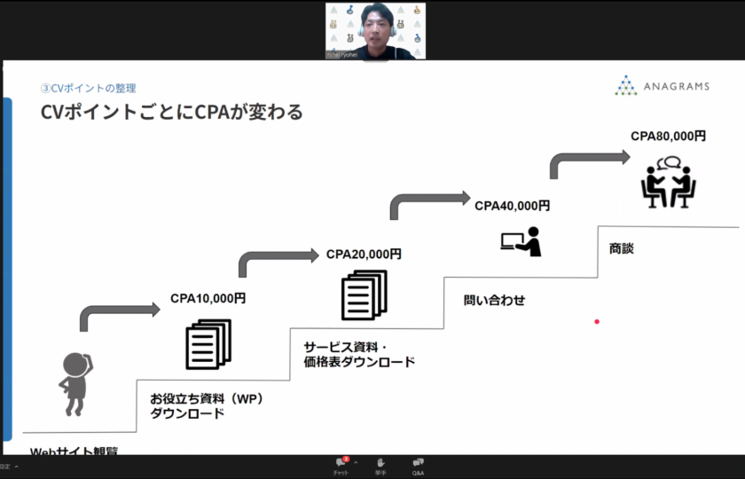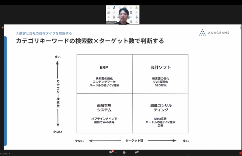 セミナーも後半パートに差し掛かり、前半パートで学んだポイントを用いて、事例からどのように広告運用のアプローチを行うかを参加者と一緒に考察していく時間が設けられた。