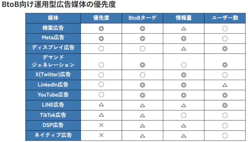 検索広告やMeta広告など多くの企業で配信しているであろう媒体だけではなく、BtoB広告運用でも多様な媒体を活用できるということが示されている。