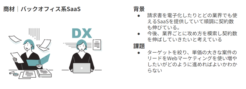 取り上げられたケースは、幅広い業界で活用できるバックオフィス系のSaaSを販売する企業が、建設業界に特化して広告配信する場合である。この場合は、どのようなアプローチが成果に繋がるかを考えていく。