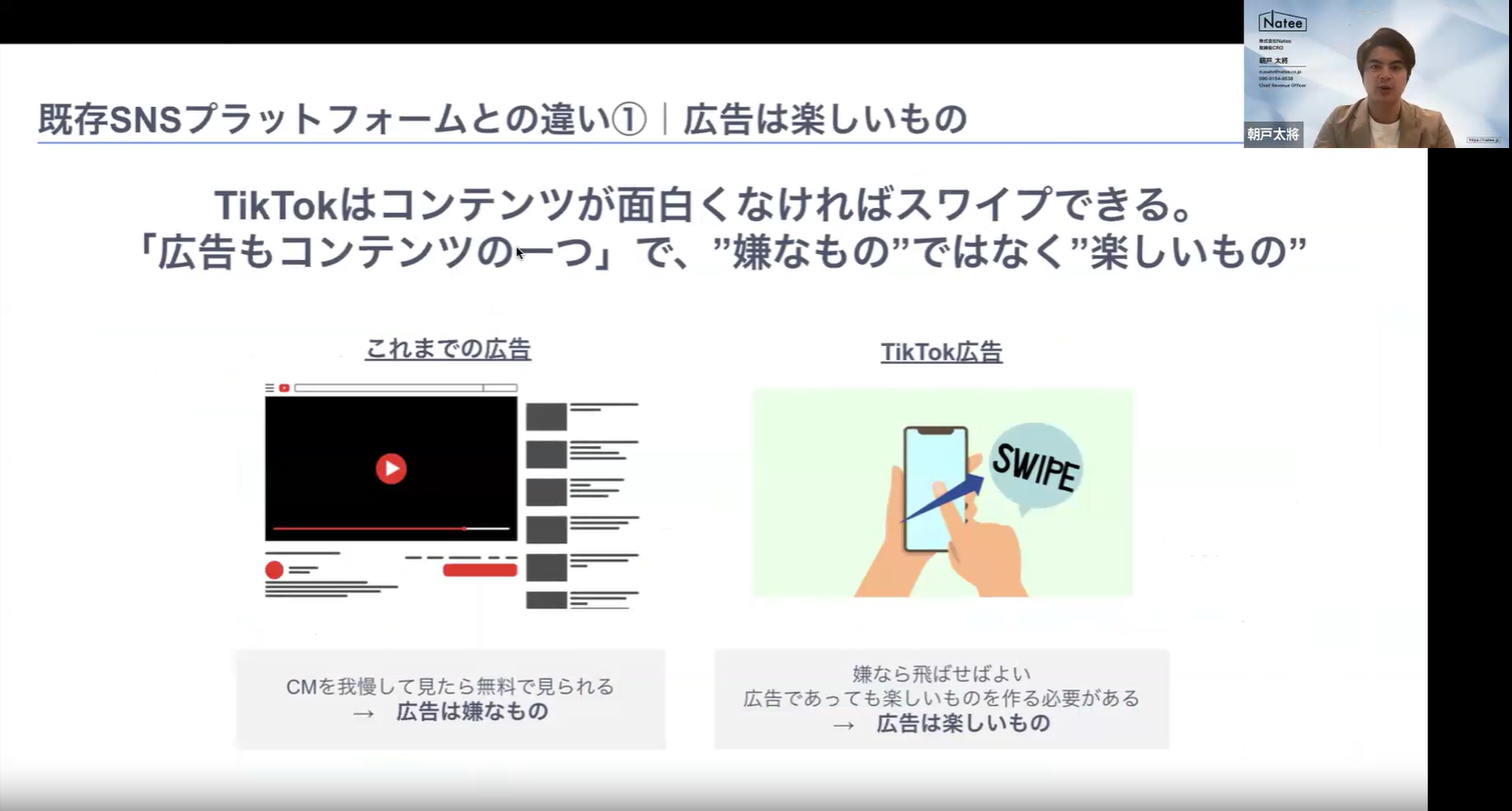 広告として何かを売り込みたいという発想よりは、TikTokというプラットフォームに合う動画に広告の要素を載せるという順番で考えていくことが、TikTokでは非常に重要だと朝戸さんは話します。