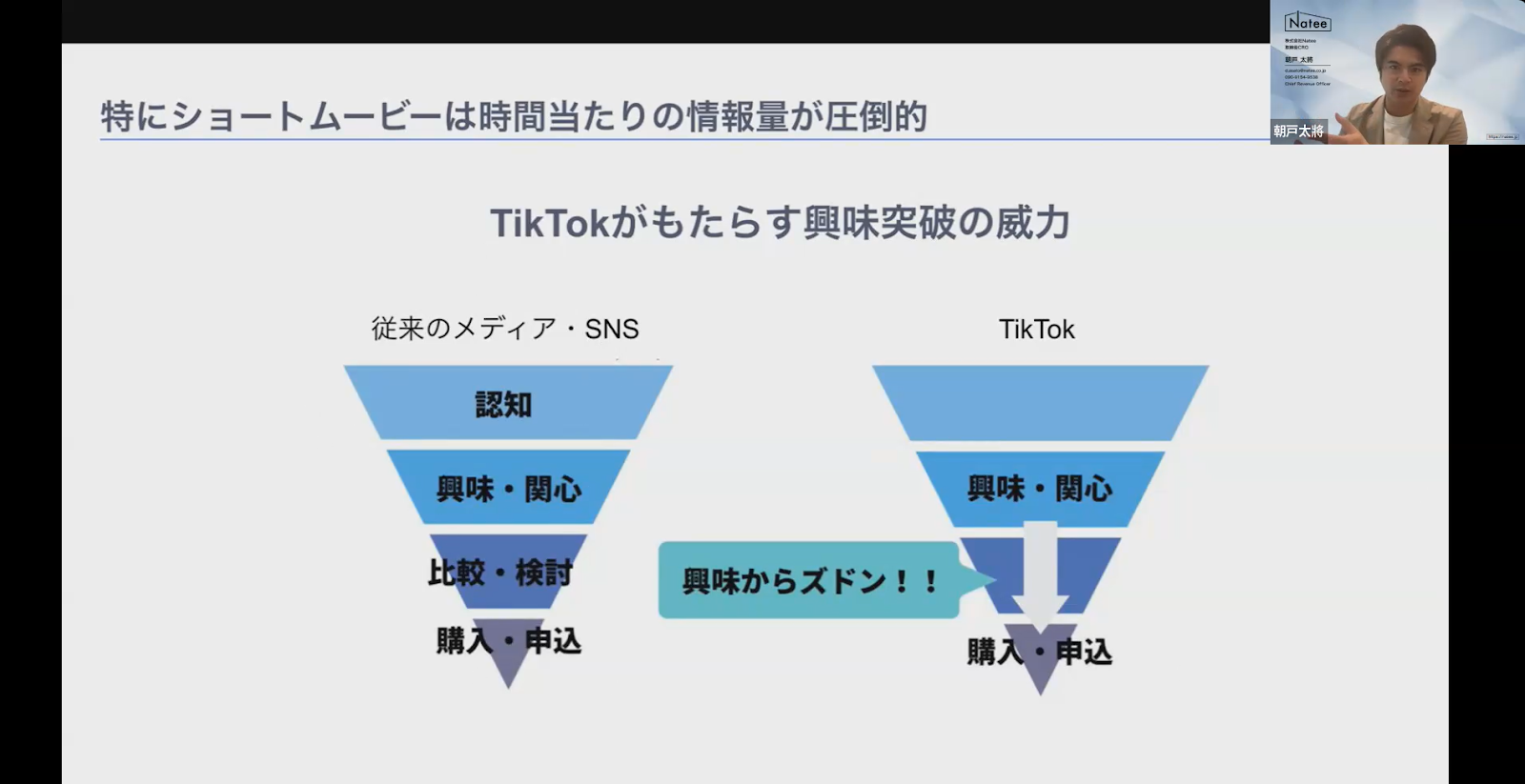 TikTokなどのショートムービーは、時間当たりの情報量が圧倒的なため、商品の認知を高めるだけでなく、さらには興味・関心を引きつける、ファネルを超えていく力があります。