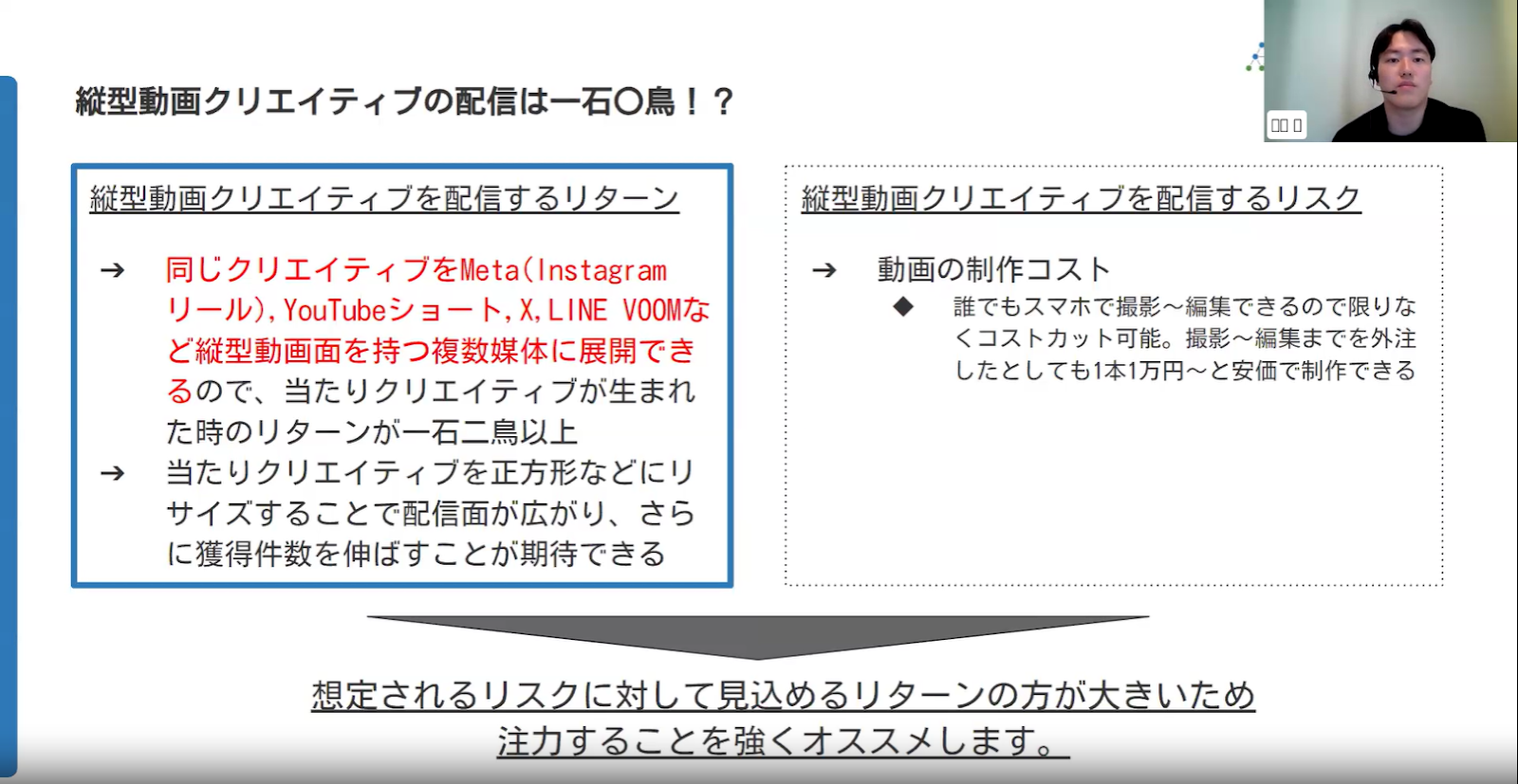 縦長動画の良いところは、誰でも簡単にスマホで撮影から編集まで行えるところです。外注したとしても、撮影から編集まで1本1万円から制作が可能なため、リスクは低いです。リスクよりも見込めるメリットの方が大きいため、ぜひ縦長動画には注力していただきたいですと、仙座さんは話します。