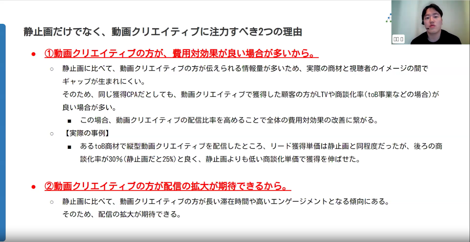 また、静止画よりも動画の方がリードの商談化率が高いというお話も興味深かったです。