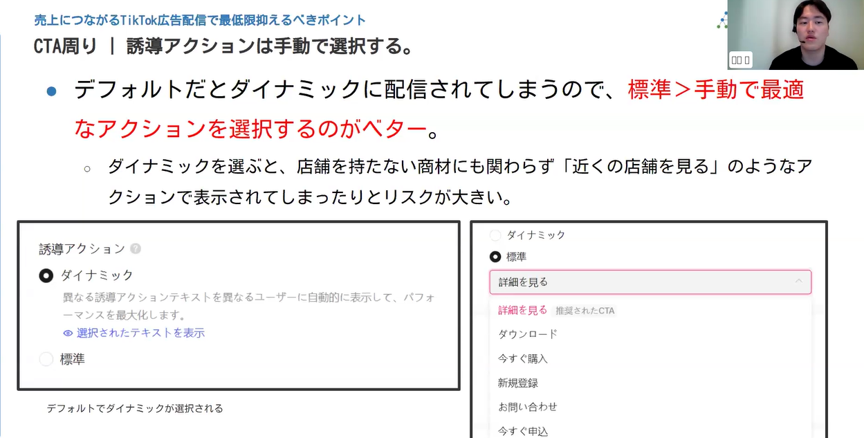 例えば、店舗を持たない商材にも関わらず、「近くの店舗を見る」が表示されてしまう事態も起こりえます。誘導アクションは「標準」を選び、商材に適した誘導アクションを選ぶのが重要だと仙座さんは話します。