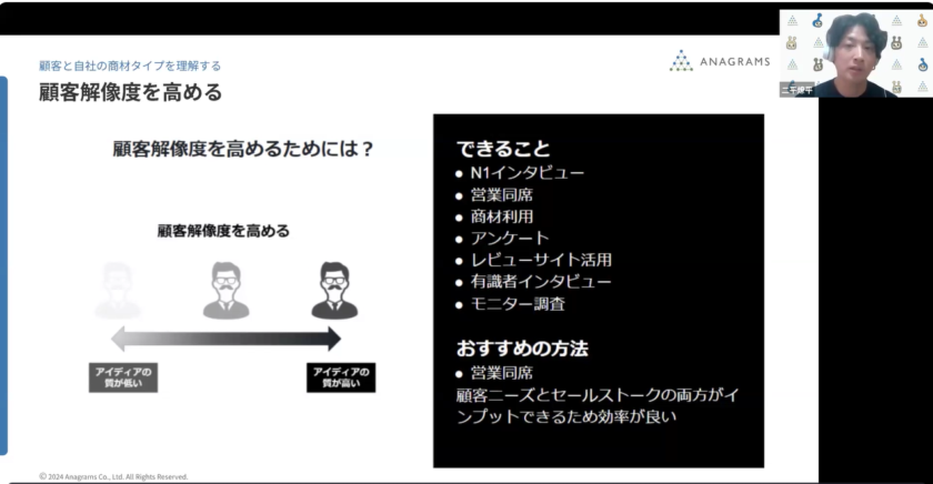 顧客解像度を上げるためにできることは複数ありますが、特にN1インタビューや営業同席がおススメです。BtoB商材を売っていくにはユーザーの課題・他社の商材理解・自社の強みの理解が必要で、実際に商品を購入した方やトップセールスにお話を伺うことでこれらをインプットできることが多いです。