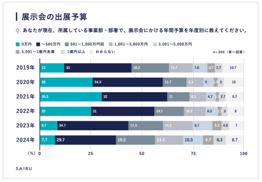法人リードの獲得にオンライン広告の利用が一般化した一方で、展示会への出展回数や年間予算はコロナ禍以前の水準に戻りつつあることが分かっています。