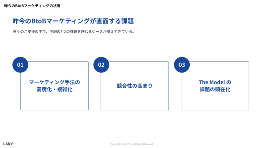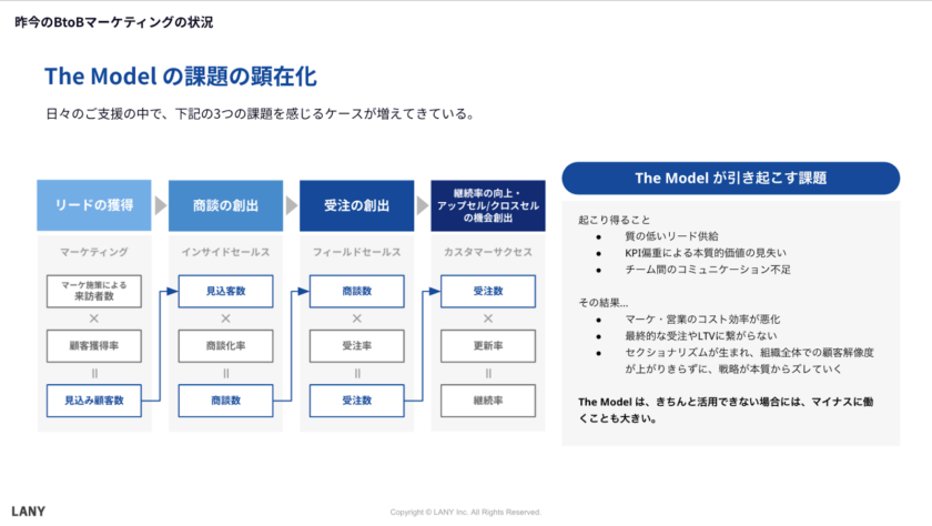 The Modelの導入により、マーケティング活動を通じてリードを獲得しやすくなった一方で、導入企業の中でも、マーケティング部門とセールス部門の連携が不十分な場合、以下のような課題が発生しています。