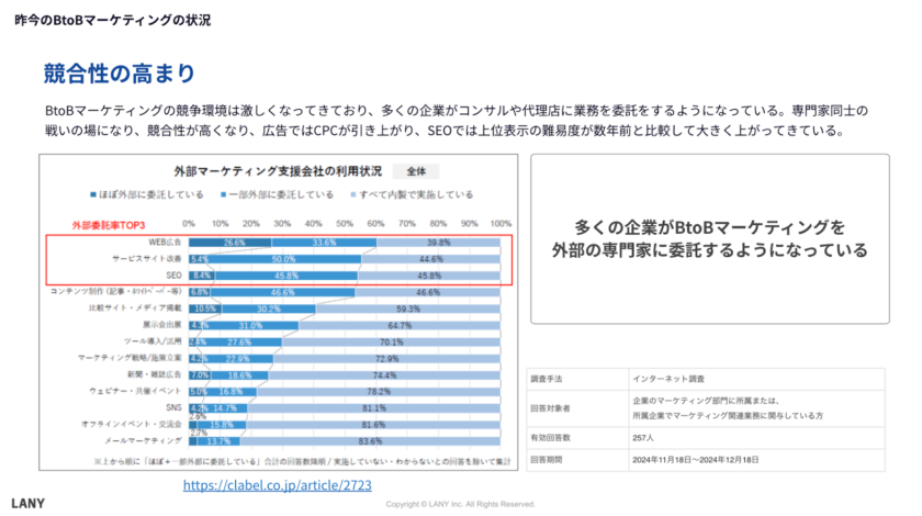 また、DX支援を行う株式会社シーラベルが行った、BtoBビジネス展開をしている企業の経営層、マーケティング責任者、担当者257名を対象にしたアンケートでは、Web広告やサイト改善、SEOはコンサルや代理店に外注する広告主が増えていることがわかりました。