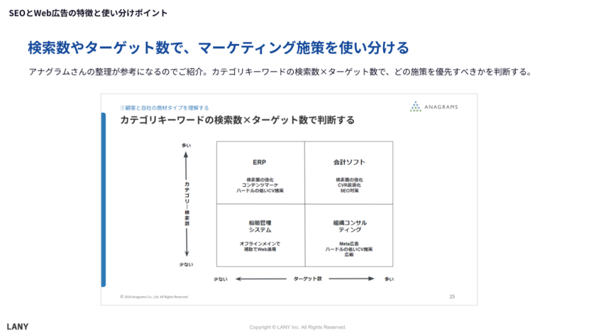 そのような中、2025年2月5日、SEOに強みをもつデジタルマーケティング やコンテンツマーケティングの支援を提供している株式会社LANYさんと運用型広告に強みを持つ弊社とで共催セミナーを実施しました。