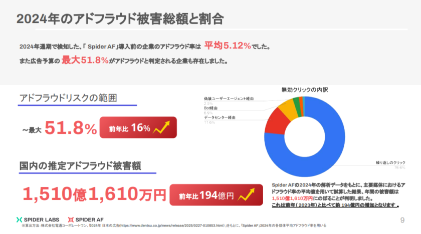 Spider Labsの調査データによると、アドフラウドによる国内の推定被害額は1,510億円に達し、前年から194億円も増加しているそうです。