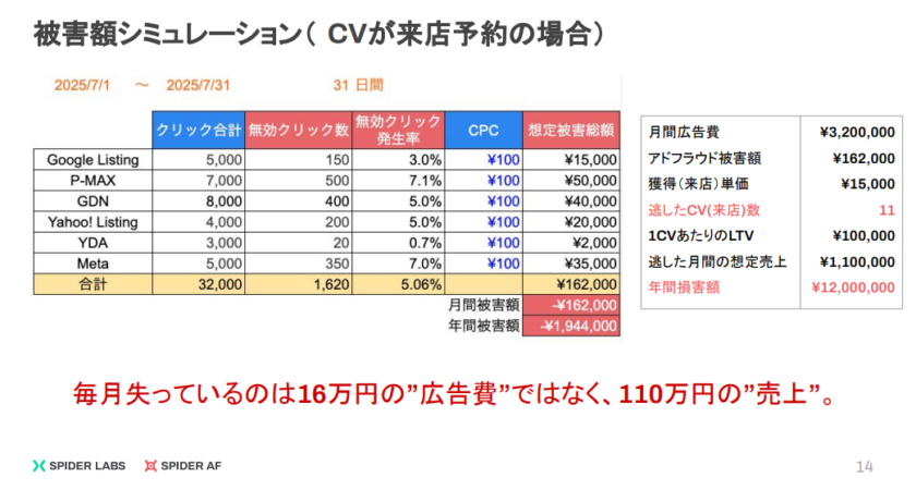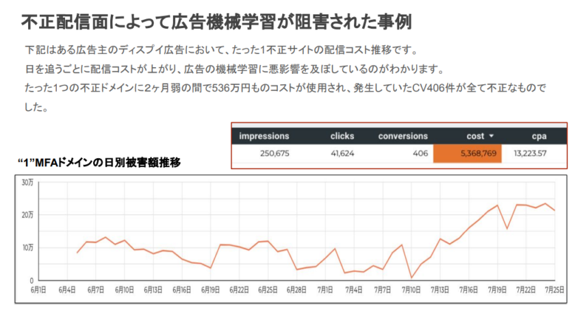 紹介された事例では、1つの不正サイトに配信が集中し、2ヶ月で536万円を浪費。 発生したコンバージョン406件は全て不正で、AIはその面を「成果が高い」と誤認し配信を集中させていたそうです。