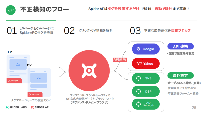 セミナーでは、そういった運用体制を構築する方法の一つとして、不正アクセスを自動検知・ブロックできるツール「Spider AF アドフラウド対策」が紹介されました。