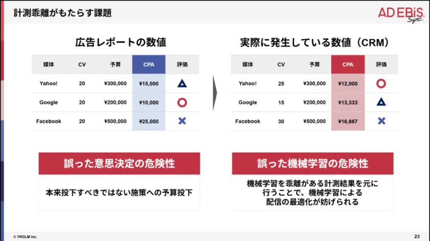 こうした計測の乖離を放置すると、アドフラウドと同様に「投資配分を誤る」「成果の高い媒体を止める」など、経営インパクトの大きい判断ミスに繋がる恐れがあると指摘されていました。