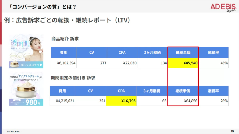 実際のクライアント事例では、訴求内容ごとにLTVを分析したところ、商品紹介訴求に対して、値引き訴求はCPAが安い一方でLTVが低いことが分かりました。