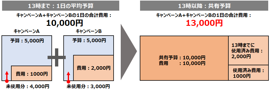 仮にキャンペーンAとキャンペーンBを運用中、それぞれ日予算を5,000円で運用していたとします。13時にAB合算の共有予算(10,000円)に切り替え、それまでにAで1,000円、Bで2,000円の費用を使用していたとします。