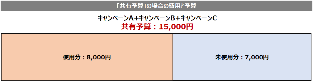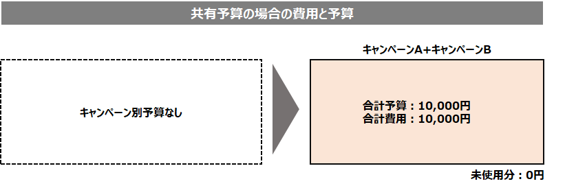 一方で、共有予算の場合、AB双方に10,000円の「共有予算」を設定しておけば、キャンペーンBでは残った1,000円がキャンペーンAに再配分されます。結果、キャンペーンの全体的な配信量は伸びやすくなります。