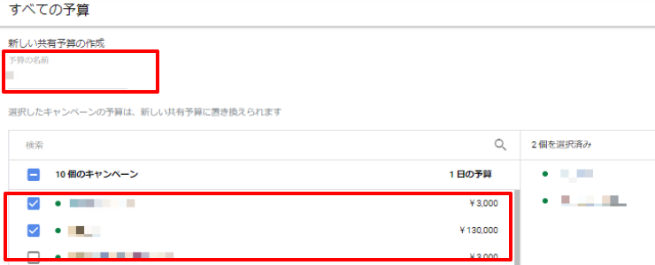 3.新しい共有予算の名前を入力し、共有予算で管理したいキャンペーンを選択します。