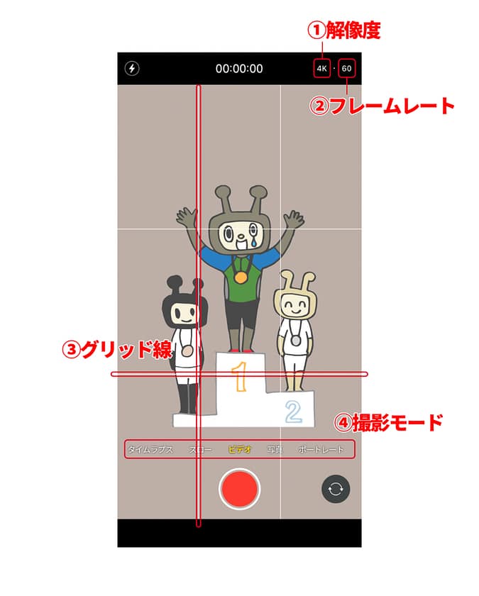 フレームレートは1秒あたりに表示する画像数のことです。ほとんどのスマホでは、30fps(1秒間に表示される画像数が30枚)もしくは60fps(1秒間に表示される画像数が60枚)のどちらかを選択します。