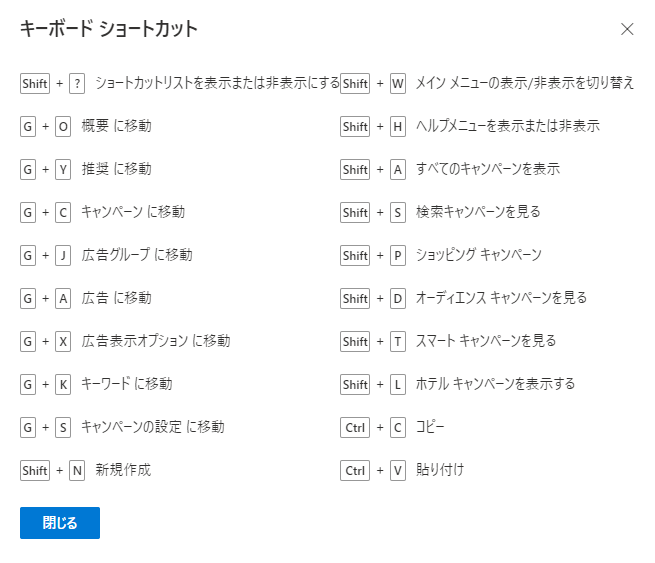 しかし、Microsoft広告・広告エディターのショートカットキーでは移動に関するものは「G」から始まるなど共通性があり覚えやすいものが多かったと思います。