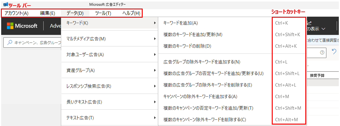 参考:キーボードショートカットの使用法-Microsoft Advertising