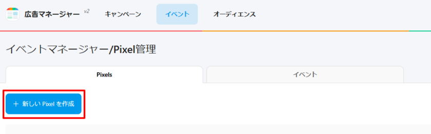 ①管理画面のログイン後、画面上部の「イベント」>「新しいPixelを作成」をクリック
