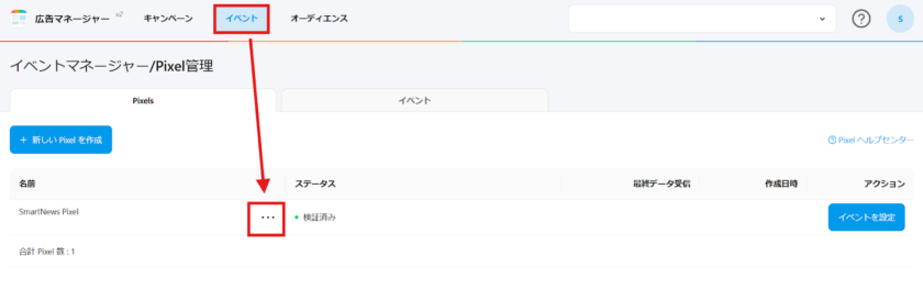 1.管理画面の上部「イベント」タブをクリック後、作成したPixelの三点リーダーをクリック