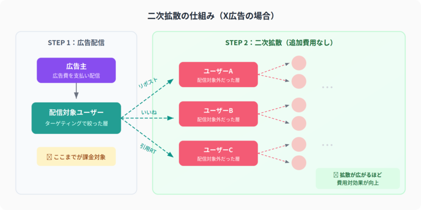 以下の図は、SNS広告特有の「二次拡散」の仕組みを表したものです。広告主が費用を払って配信した広告が、リポストやいいねを通じて配信対象外のユーザーにまで広がっていく流れがわかります。X広告ではこの二次拡散分に追加費用が発生しないため、拡散されるほど費用対効果が高まります。