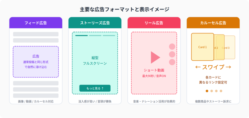 | カルーセル広告 | 1つの広告枠で複数の画像や動画を横スワイプで表示できるフォーマット。各カードに異なるリンクを設定可能。複数商品の紹介やストーリー仕立ての訴求に適している。Meta広告・X広告で利用可能 |