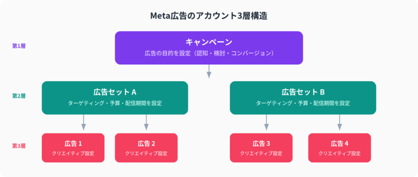 Meta広告のアカウントは「キャンペーン → 広告セット → 広告」の3層で構成されています。各階層の役割を理解することが運用の出発点です。