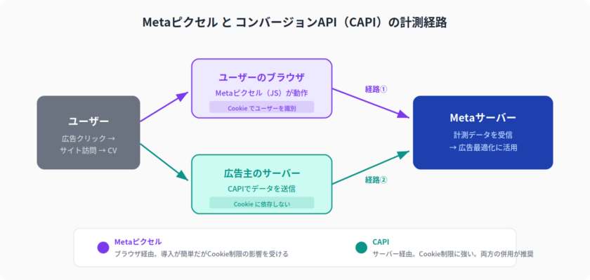 以下の図は、MetaピクセルとCAPIの2つの計測経路の違いを示しています。ピクセルはブラウザ経由でCookieに依存する一方、CAPIはサーバー間の通信でCookie制限の影響を受けにくいのが特徴です。両方を併用することで計測精度を最大化できます。
