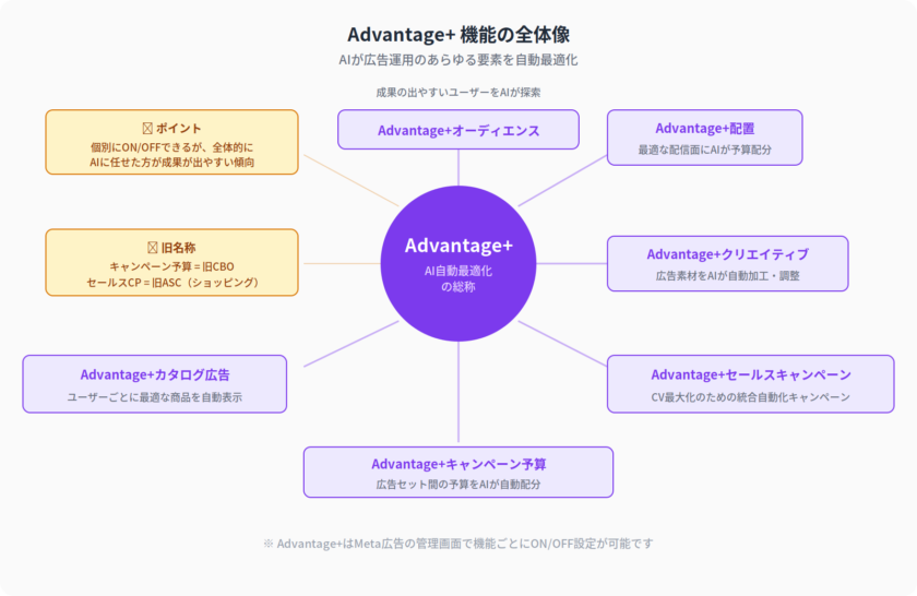 Advantage+はMeta広告のAI自動最適化機能の総称です。予算、オーディエンス、配置、クリエイティブなど運用のさまざまな要素をAIに委ねることで、工数削減とパフォーマンス向上を同時に目指します。以下の図で各機能の関係性を確認しましょう。