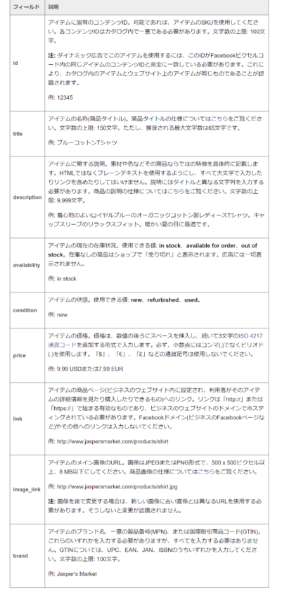 Facebookの製品フィードの列名(Google 商品フィードでは属性名)は英語で記入する必要がある